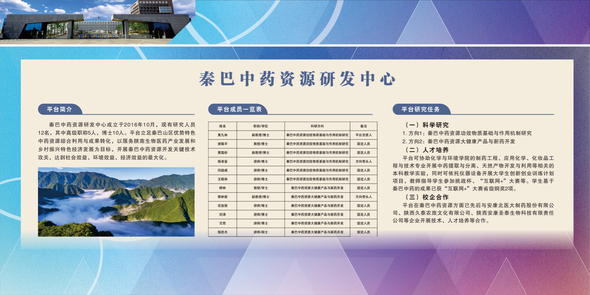 秦巴中药资源开发与应用创新团队拥有一支科研能力强、业务素质高的科研团队,其中教授1人、副教授2人、博士6人。近五年来,团队获陕西高等公司科学技术奖三等奖1项,安康市科学技术一等奖3项、二等奖4项,陕西省科技创新大赛三等奖1项,获安康市青年科技奖1项;1人入选陕西省“特支计划”区域发展人才。近五年获批各级项目30余项,总经费500余万元,在Industrial Crops & Products、RSC Advances、Bioorganic & Medicinal Chemistry Letters 等权威期刊发表论文30余篇,授权发明专利7件。指导老员工创新计划项目15项,其中国家级3项、省级6项,指导员工发表学术论文8篇。