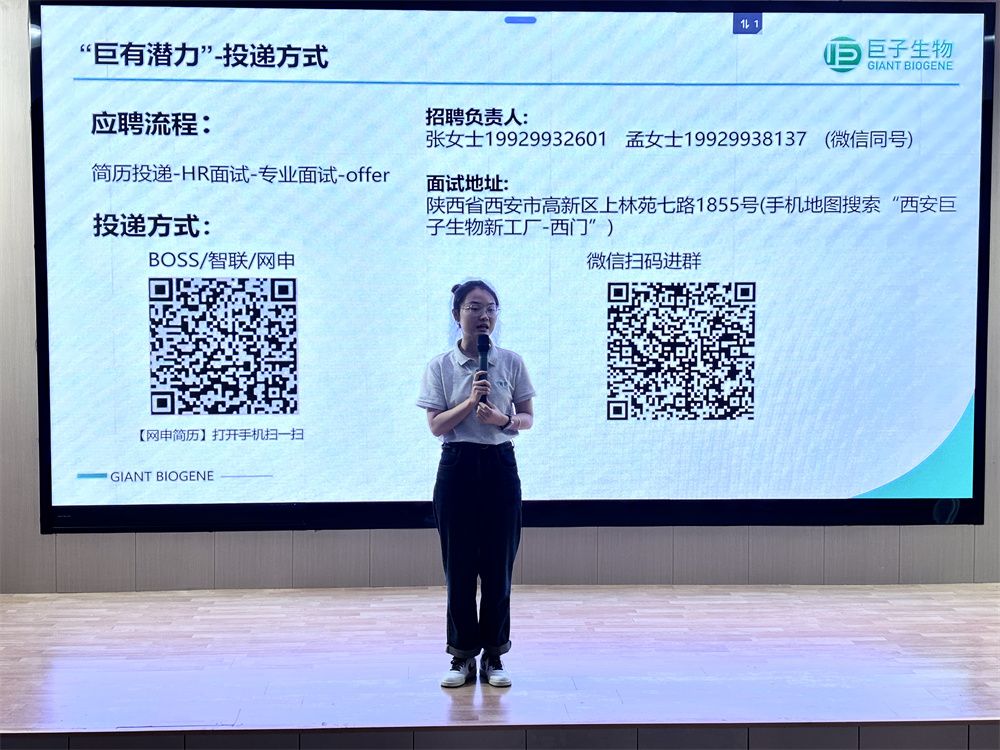 西安巨子生物基因技术股份有限公司人力资源总监张宇以《职等你来》为题做主题报告,详细介绍了巨子生物的主要产品线、科技研发进展、科创成果转化、未来战略布局等。并就西安的西部中心城市的区位优势、当前行业的发展趋势和就业前景、公司产品的竞争力和薪资待遇等进行介绍。