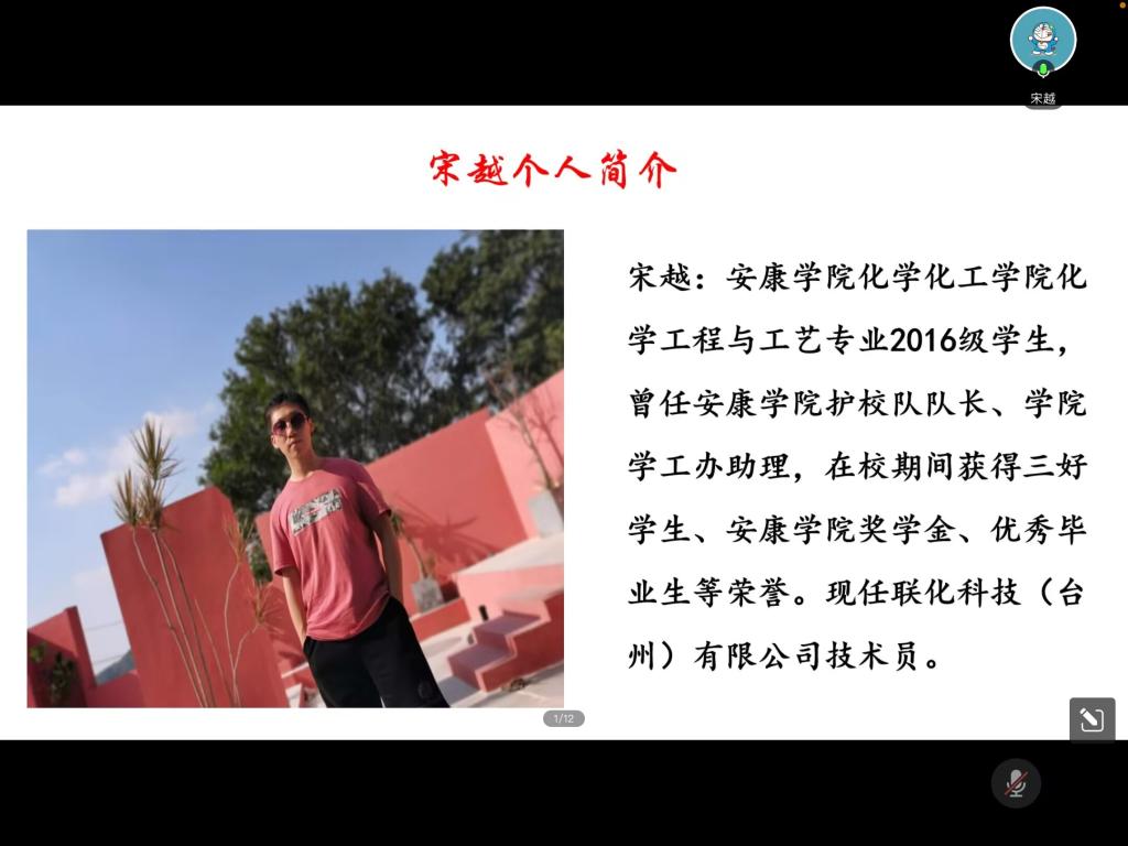 宋越,公司2020届化学工程与工艺专业毕业生,在校期间担任校护校队队长、学工助理,曾获得国家励志奖学金、三好员工、校级优秀毕业生等荣誉,现就职联化科技(台州)有限公司技术员。