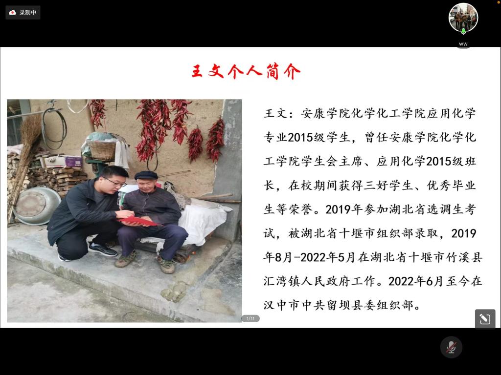 会议开始,王瑜老师对王文、宋越和穆开朗的到来表示感谢,感谢他们能够通过线上方式重返母校,与学弟学妹相聚云端,分享个人的求职体验和职业发展规划。