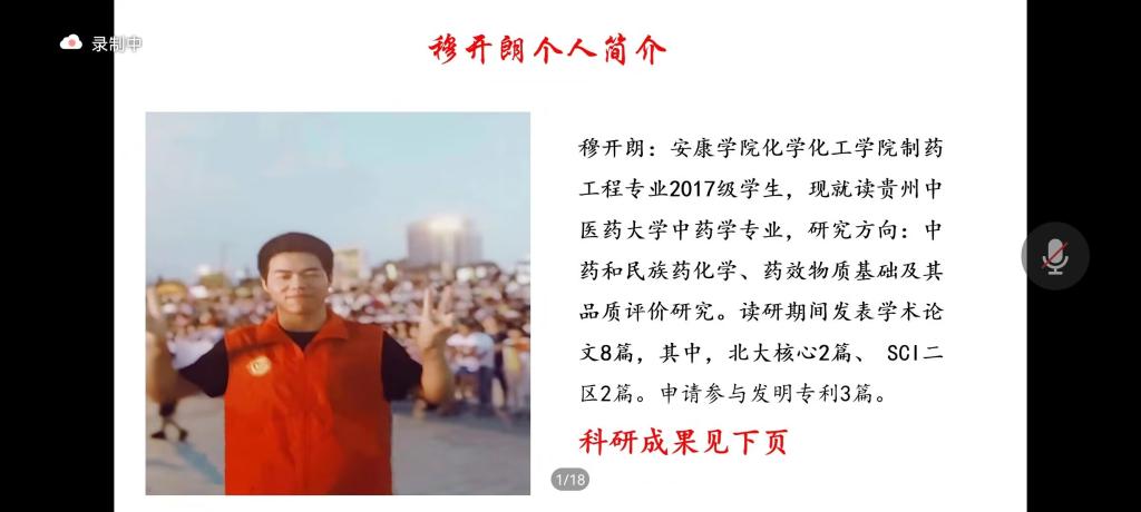 穆开朗,2021届制药工程专业毕业生,在校期间担任公司富硒检测中心助理,获得3次国家励志奖学金、省级优秀毕业生,以第一作者发表学术论文3篇,其中核心2篇,主持国家级大创项目1项,现就读贵州中医药大学中药学专业。