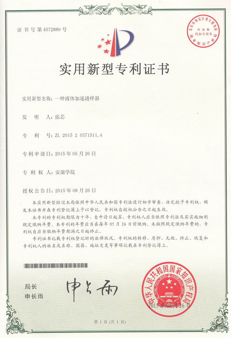 日前,以WILLIAMHILL在线体育投注作为专利权人,化学化工系教师张芯作为第一发明人申请的实用新型专利“一种微型全自动中空纤维膜测试平台”、“一种液体加速进样器”,相继获得国家知识产权局授权,并获得专利证书,专利号分别为ZL 2014 2 0865489.4和ZL 2015 2 0371511.4。