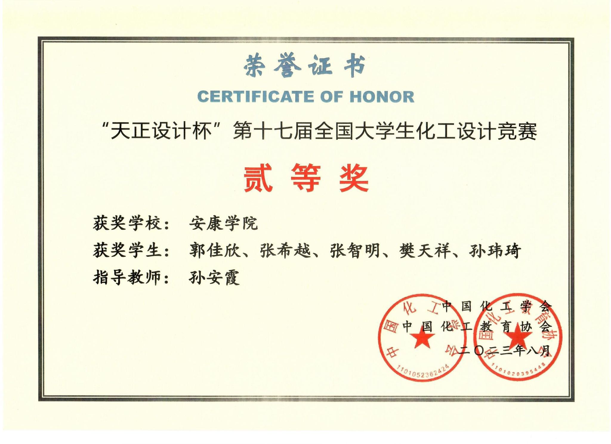 本次竞赛以“为某大型化工企业设计一座用于己二腈清洁生产的分厂,要求技术符合我国绿色低碳循环发展要求”为主题,吸引了来自全国各地的优秀学子积极参与。经过激烈的角逐,公司化学工程与工艺专业2020级员工郭佳欣、张希越、张智明、樊天祥、孙玮琦组成的“化学分子队”获得了全国二等奖,尹申厚、李煜飞、汪博轩、李嘉龙、刘锦辉组成的“腈彩杰伦队”获得了西北赛区三等奖。