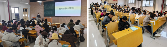 为提升新生对公司第二课堂人才培养目标的了解与掌握、养成良好的学习生活习惯,公司于12月9日分别在江北1304、1305教室开展了“如何获得PU学分”的专题活动,本次活动由新生辅导员李锦龙和代雨蕊主讲,2024级全体新生参加。