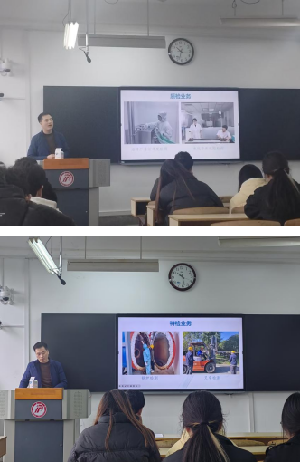 李涛工程师从事质量检验检测工作多年,具有深厚的专业背景。他详细分析了我国质检行业的发展和第三方检测机构的现状,从当下人工智能在各个领域的应用、宇树科技的发展以及习近平总书记主持召开的民营企业家座谈会为例,勉励同学们努力成为不断学习型人才,才能在以后的岗位更好拥有自己的价值。