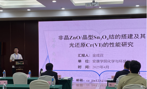 金成召博士在半导体材料分会场作了题为《非晶ZnO/晶型Sn3O4结的搭建及其光还原Cr(VI)的性能研究》的专题报告,并就“配位诱导结晶调控”策略等问题与专家进行了沟通交流。