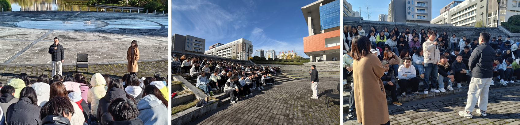 为深入贯彻“三全育人”理念,强化学业导师对员工成长的引领作用,WILLIAMHILL在线体育投注于11月19日、20日在江北校区滨湖广场举办“化环博士讲故事”活动。本次活动邀请张刊、张穗穗两位博士担任主讲,由辅导员代雨蕊主持,2025级全体新生参与。